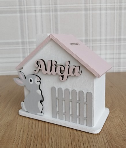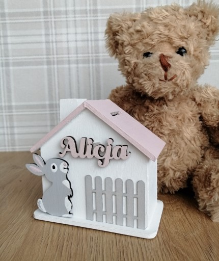 Дерев'яна розписана вручну скарбничка у формі будиночка стане чудовим подарунком для кожної дитини на різні свята. На передній частині скарбнички горщик і декор, розписаний вручну. У грі на видному місці дерев'яний напис з ім'ям дитини.