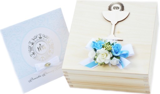 Оздоблення в ніжних блакитних тонах з біло-зеленими аксесуарами. У набір входить блакитний сувенір Першого Святого Причастя, який доповнює гарний зовнішній вигляд скриньки, який можна використовувати як місце для Біблії, Причастя або молитовника.