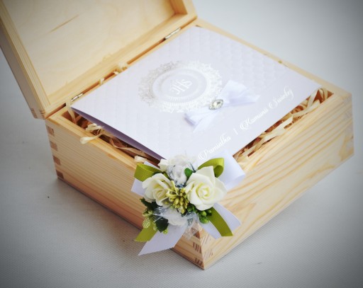 Оформлення в ніжних рожевих тонах з біло-зеленими аксесуарами. Вся річ виготовлена зі стрічок і штучних, губкових квітів найвищої якості і є вишуканим подарунком для маленької дівчинки. Сувенір ніжного червоного кольору. Дерев'яну скриньку також можна використовувати як скриньку для зберігання прикрас, різдвяної книги, книги-перемотки або інших дрібниць для маленької дівчинки.
