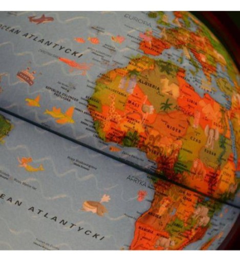 Цирковий глобус з підсвічуванням встановлений на дерев'яній основі та закріплений на пластиковому меридіані. Карта польською мовою. Розмір м'яча 25 см, висота 33 см. легка заміна лампи.