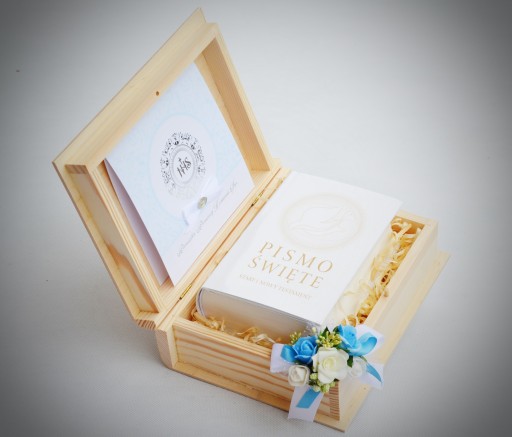 Оздоблення в ніжних блакитних тонах з біло-зеленими аксесуарами. У набір входить блакитний Сувенір Перше Святе Причастя, який доповнює гарний зовнішній вигляд скриньки і може бути використаний як місце для Біблії, Причастя або молитовника.