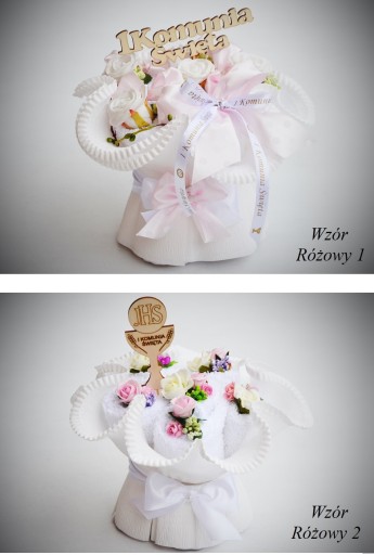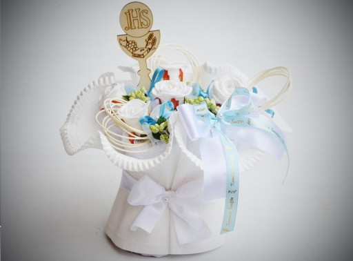 в провідних біло-блакитних кольорах. Ідеальний подарунок замість живих квітів до Першого Святого Причастя - після розгортання букета м'які рушники ідеально підійдуть, наприклад, для футбольного тренування.3 дизайни на вибір: