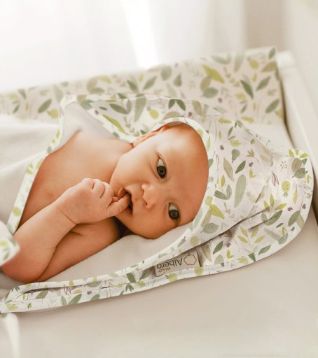 Чохли Albero Mio виготовлені з надзвичайно поглинаючої, пухнастої, м’якої та приємної на дотик термопіни. Вони сушать тіло дитини і мають капюшон, що захищає голову. Чохол має красиву кольорову аплікацію на капюшоні та обробку виробу.