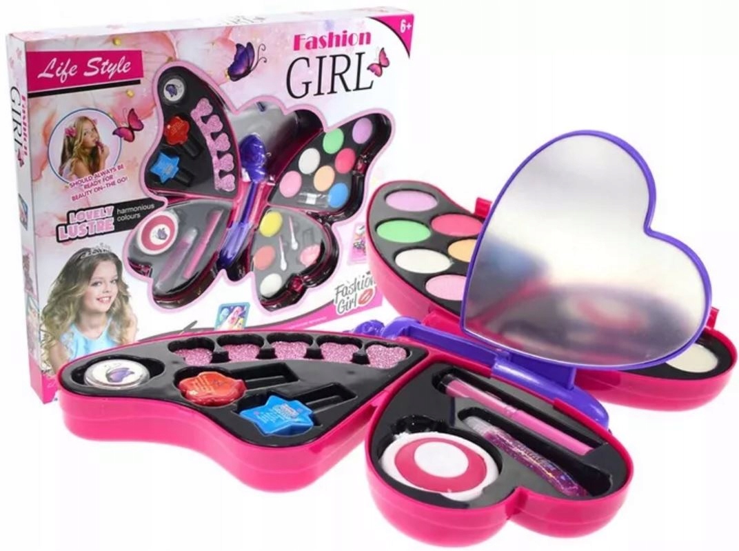 Piękny zestaw do malowania zawiera wiele akcesoriów, które pozwolą na odtwarzanie rożnych stylizacji. Kosmetyki zostały umieszczone w ciekawym pudełeczku w formie motyla.