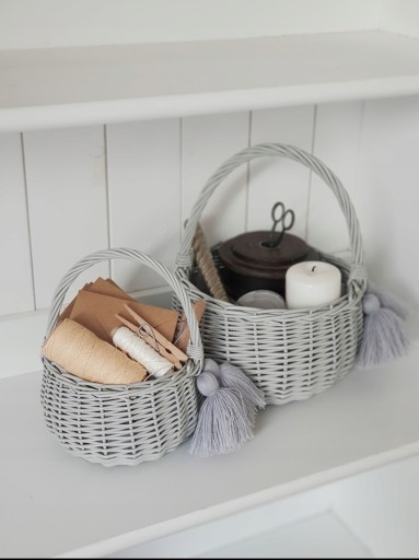 Кошик повністю ручної роботи з лози найвищої якості з польських ферм. Він пофарбований у світло-сірий колір спеціальною екологічною фарбою, яка дуже стійка до пошкоджень. Наші фарби сертифіковані PZH і можуть використовуватися для фарбування дитячих іграшок та меблів.