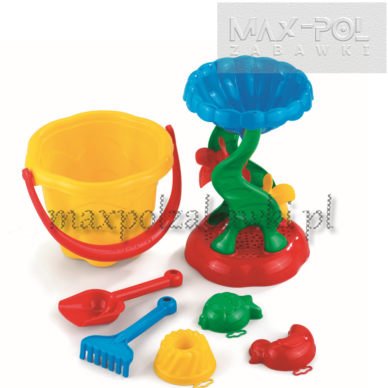 Następnym elementem całości jest „zestaw do piasku”. W jego skład wchodzi plastikowe wiaderko, trzy foremki (ptaszek, rybka, babeczka), małe grabki i łopatka. Młynek ma dwa „wiatraczki”, które podczas zasypywania lejka piaskiem lub wlewania wody obracają się. Młynek można założyć na wiaderko i przesiewać do niego piasek dzięki temu, że w podstawie młynka jest sitko. Każde dziecko wybierając się na plac zabaw czy też na wakacyjną plażę może z powodzeniem zabrać zestaw ze sobą i tam w pełni korzystać z rozrywki.