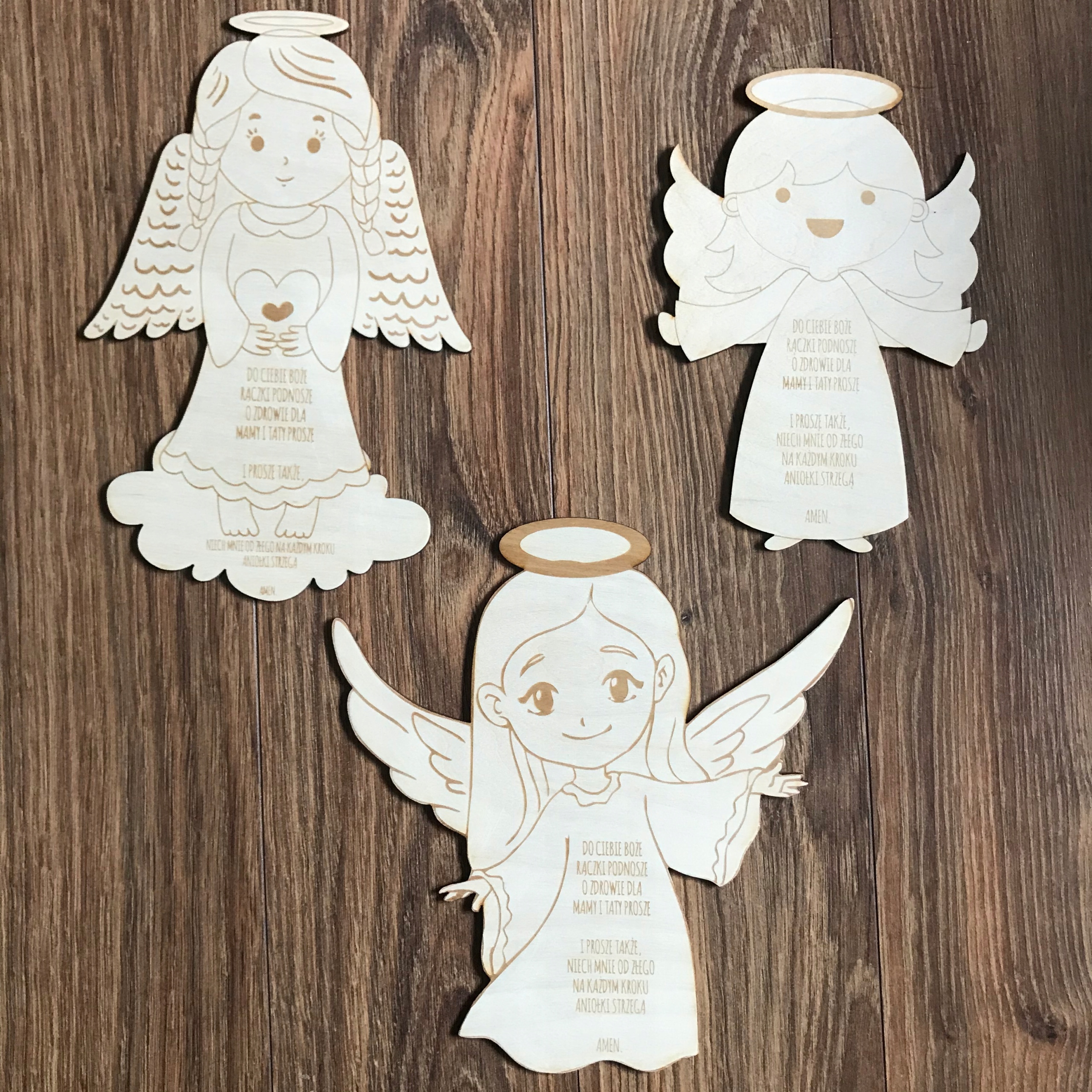 Aniołek wycięty laserowo ze sklejki brzozowej.