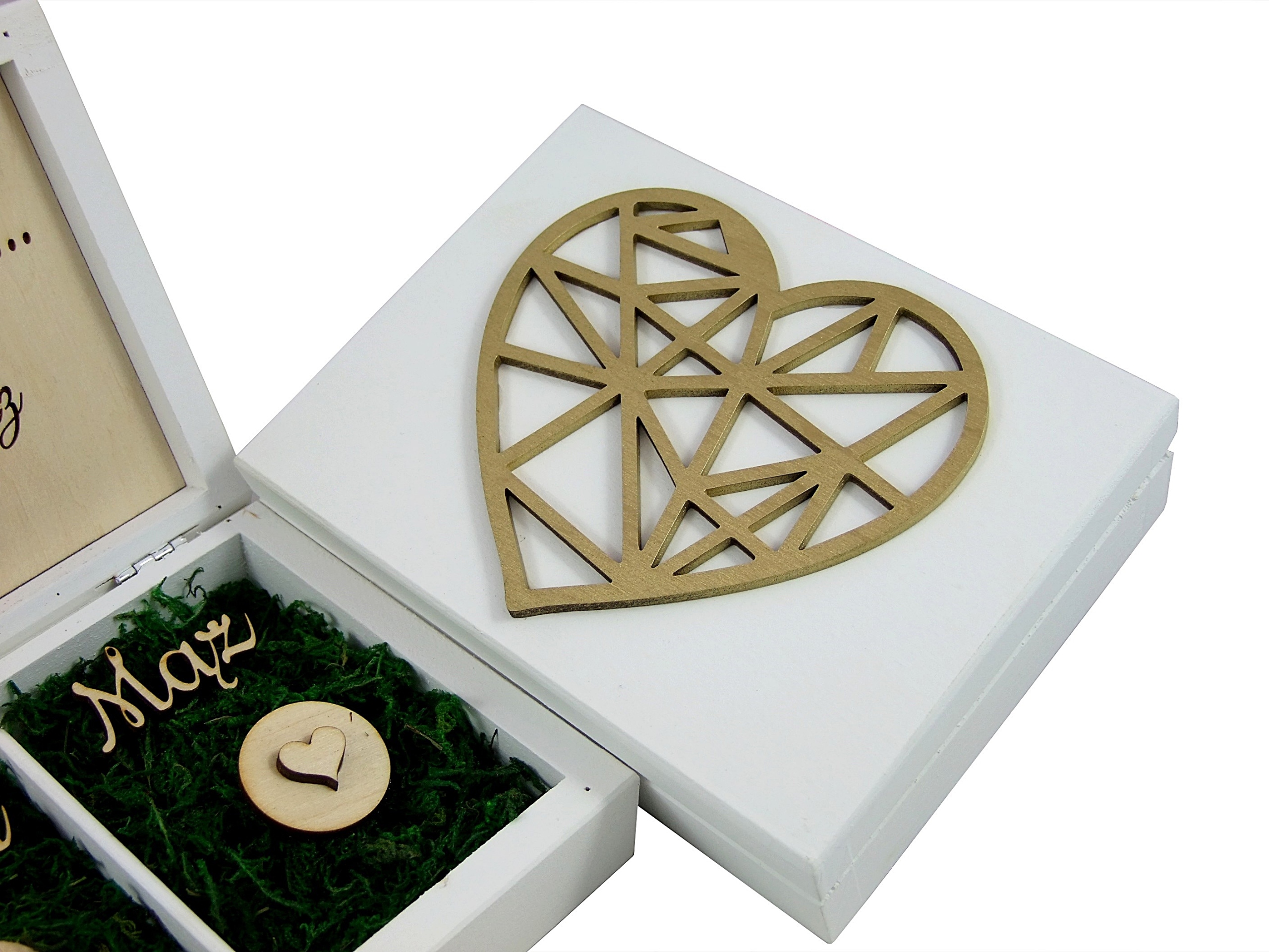 Wypełnienie to piękny zielony mech z wyciętymi napisami Żona i Mąż oraz dwoma serduszkami na obrączki