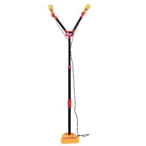 Мікрофон зі штативом запровадить кожного маленького артиста в незвичайний світ «музичної кар'єри», «ліхтариків», а також емоційних виступів перед публікою. У комплект входить штатив з регульованою висотою і можливістю зміни кута опор. Набір складається з двох мікрофонів, завдяки яким діти можуть грати разом, не чекаючи своєї черги. Кожен мікрофон можна зняти зі штатива, вони мають окремі кабелі довжиною приблизно 125 см. Використовуючи один мікрофон, ви можете підключити Mp3-плеєр до іншого гнізда і відтворювати музику прямо з пристрою. Перемикач живлення є водночас і регулятором гучності. Кнопка «Пісні» відтворює вбудовану суміш мелодій. Висота регулюється 63-130см. Мікрофони нові. Працює від 6 батарейок типу АА. (не входить в комплект) Європейський сертифікат CE. Рекомендований вік: 3+