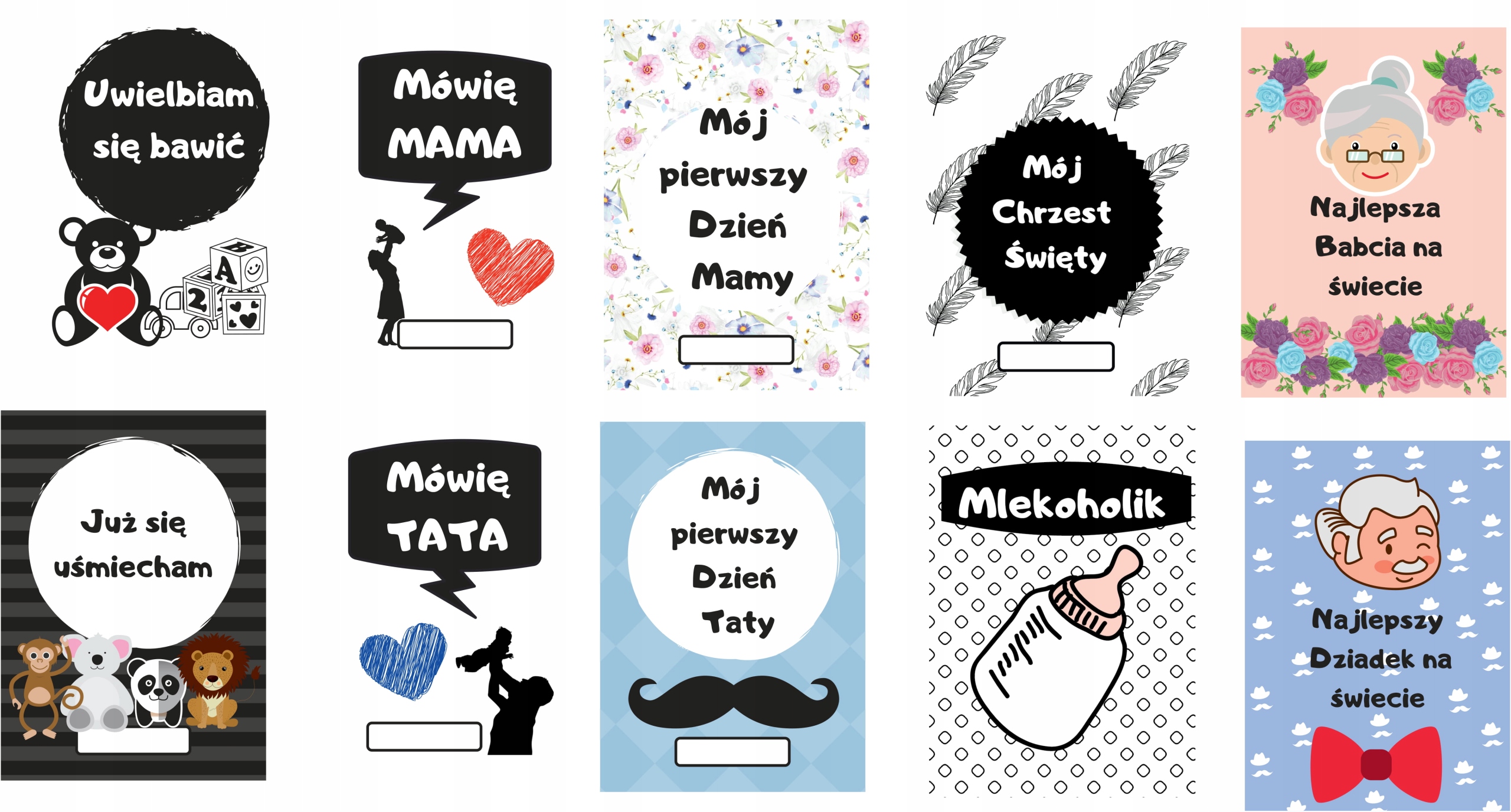 Dzięki nim w prosty i przejrzysty sposób zarchiwizujesz momenty przełomowe w pierwszym roku życia Twojego dziecka.
