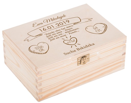 Щоб задовольнити ваші очікування, ми створили елегантну дерев’яну скриньку пам’яті ручної роботи, у якій ви можете зберегти ці спогади та моменти свого дитинства. Перша соска, фото з УЗД, звіт з пологового будинку і, можливо, коробка з дитячими сумками. З нашою коробкою ви заміните обридлу пластикову або картонну упаковку. Скринька з вашим індивідуальним присвятою та побажаннями стане незабутнім сувеніром на довгі роки.