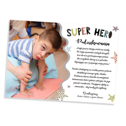 Часто ми багато чим завдячуємо лікарю, медсестрі, фізіотерапевту (...), який надасть нам / близькій нам людині підтримку, допомогу, просто проявить багато серця та відданості. А може, ви хочете подякувати комусь із великим серцем або всій палаті в лікарні/поліклініці? Варто віддячити, подарувавши персональну листівку чи плакат із фотографією вашого малюка.