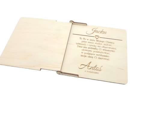 Гравірування на дереві - благородна техніка, завдяки якій на квитанції можна нанести присвяту, побажання та ім'я хрещеника та дату хрещення. Гравірування дозволяє персоналізувати подарунок і додати йому індивідуальний характер.