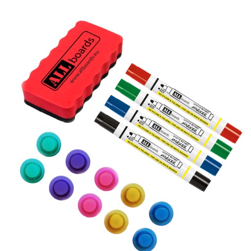 - НАБІР - разом з дошкою в набір входить повне обладнання, яке дозволяє відразу використовувати: монтажний набір, поличка для аксесуарів, губка, набір магнітів і набір маркерів.
