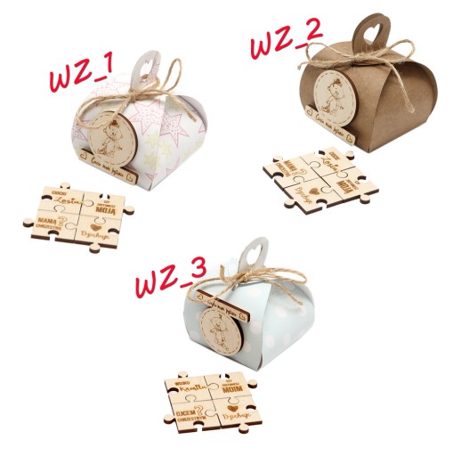 Пазли виготовлені з деревини берези, на окремих елементах вигравірувані імена хрещеної та дитини. Вони упаковані в декоративну коробку, перев'язану джутовою ниткою та прикрашену дерев'яною аплікацією.