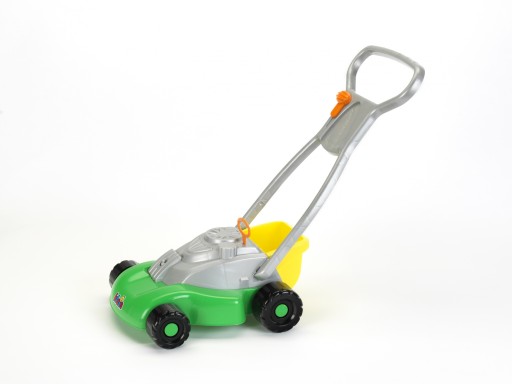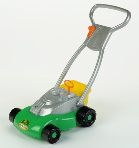 Косарка єв зеленому кольорі. Він має срібну ручку та чотири чорні колеса. Колеса рухливітому техніка може пересуватися по різних поверхнях. Внутрішня частина косарки порожня, завдяки чому вона має невелику вагу, підходить для дітей. Косарка оснащенаімітація перемикача режиміва такожподрібнювач апельсинівякий, якщо його помістити у відповідний отвір і потягнути, видає характерний звук.ÂЖовтий кошик для покупокМи можемо поставити в задню частину косарки. зручно, Ясрібна ручка іграшкиЙого довжина близько 50 см.