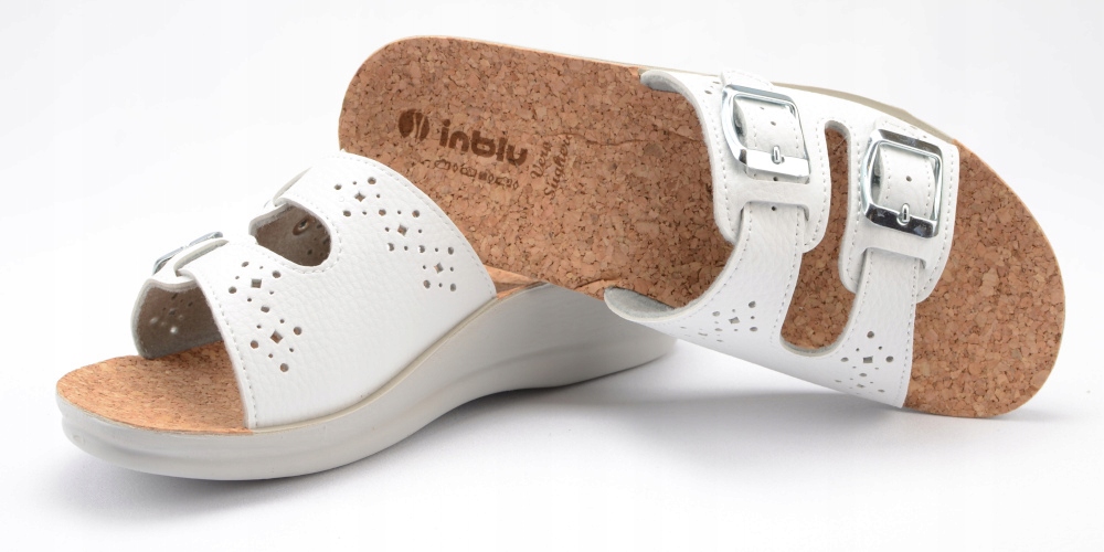 Klapki damskie INBLU na koturnie z wyprofilowaną korkową wkładką. Obuwie wykonane z najlepszej jakości ekologicznej skóry. Możliwość dopasowania szerokości obuwia do stopy za pomocą regulowanych pasków zapinanych na klamerki. Wysokość koturny 3,5 cm.