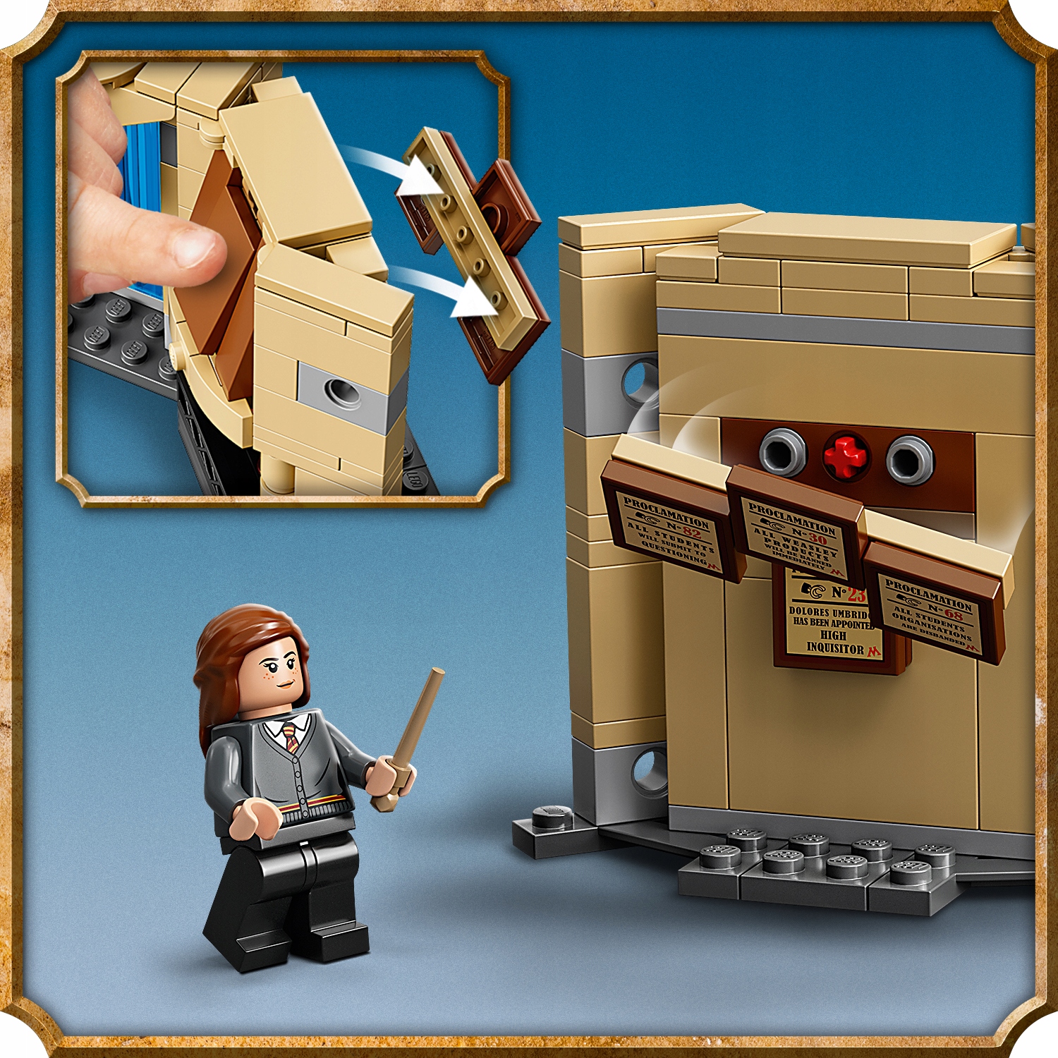 • W zestawie trzy minifigurki z różdżkami — Harry Potter™, Hermiona Granger™ i Luna Lovegood™ — dwa zwierzęce patronusy, miotacz mocy, manekin mechanicznego śmierciożercy oraz szczegółowo ukazane pomieszczenie z filarem, tablicą oraz kominkiem.