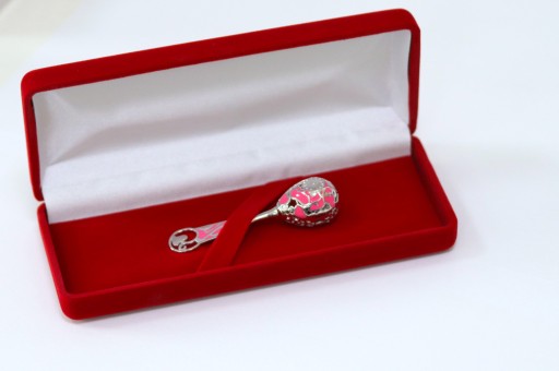 Брязкальце виготовлено зі срібла 925 проби і має доповнення рожевої емалі.
