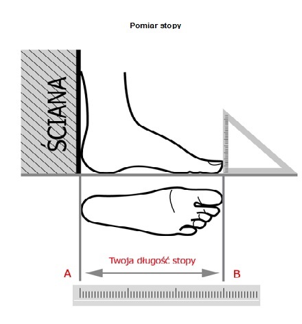 Виміряйте довжину стопи від середини п'яти А до кінця найдовшого пальця В, відзначте результат.