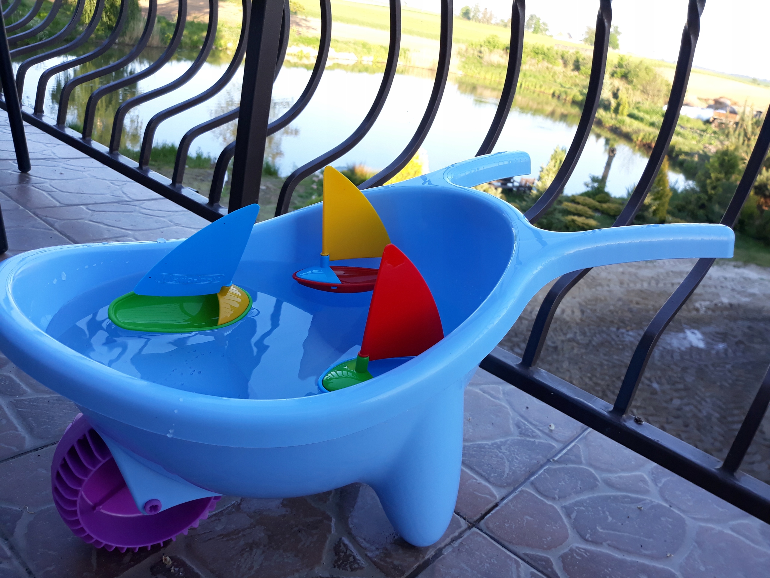 - Upalne lato? Wystarczy nalać do taczki wody dołożyć żaglóweczkę (w zestawie) i mamy mini basen - chwila ochłody i świetnej zabawy.
