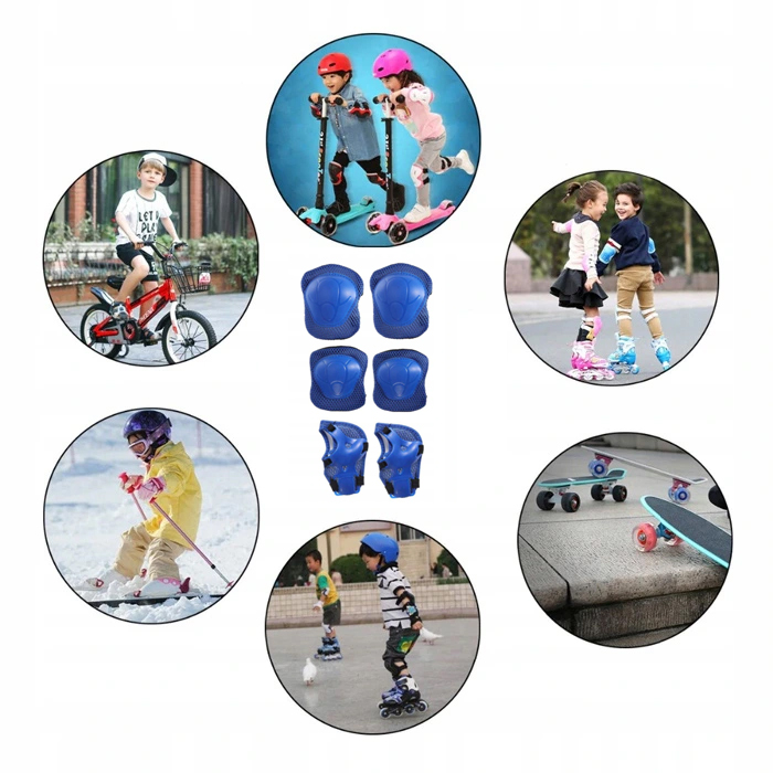 Zestaw ochraniaczy na nadgarstki, kolana i łokcie, niezbędny dla początkujących rowerzystów, rolkarzy, deskorolkarzy, użytkowników deski typu waveboard czy po prostu podczas aktywnego spędzenia czasu dzieci na świeżym powietrzu.