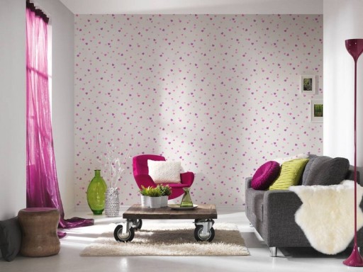 Солодкі шпалери для наших маленьких принцес. Маленькі рожеві сердечка різного розміру та відтінку на білому тлі, що переливається золотим блиском. Добре виглядатимуть шпалери як на всій кімнаті, так і на одній стіні, решту можна пофарбувати, наприклад, рожевою фарбою.