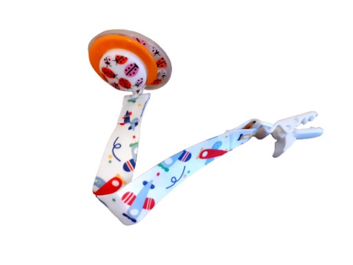 - Кліпса використовується для кріплення шлейки коляски, дитячого одягу, ковдри і т. д. Виріб призначений для виробів з кільцем [пустушка, чашка, прорізувач, іграшка]