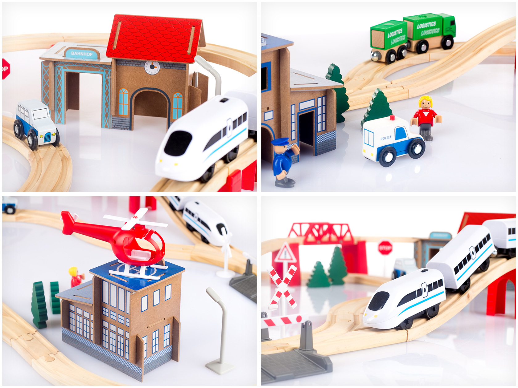 Drewniana kolej z posterunkiem policji to zestaw 80 elementów. Całość składa się z wielu ciekawych elementów w tym np. pojazdów, znaków drogowych, drzew, szlaban i mostek. Duża liczba akcesoriów sprawia, że dzieci będą się bawić zabawką bez końca, przy okazji rozwijając również swoją zręczność, koordynację wzrokowo – ruchową, kreatywność oraz wyobraźnię. CAŁKOWITA DŁUGOŚĆ TORU - 378 CM!