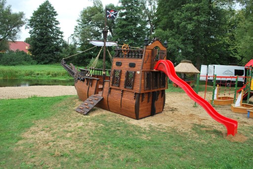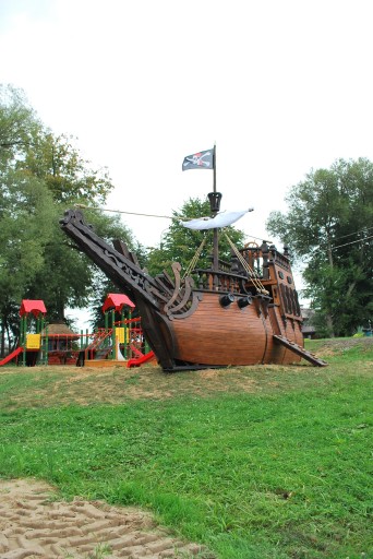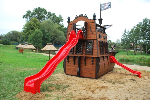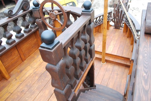 - піратський корабель розмірами: ширина 2,5 м; довжина 9м з прогинами; висота рульової рубки приблизно 4 м, висота щогли 5,5 м