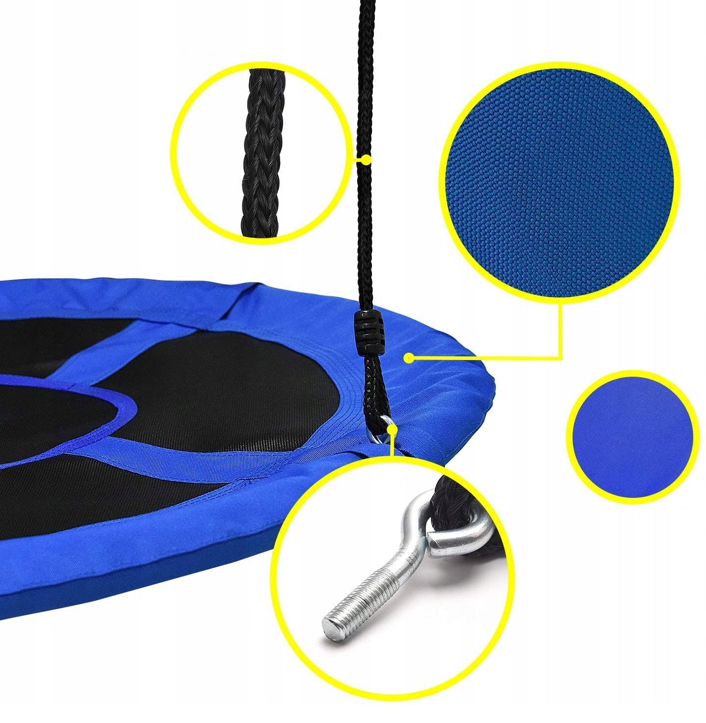 Produkt posiada wytrzymałą metalową obręcz z piankową otoczką, wewnątrz której znajduje się mocna siatka. Całość wykończona została za pomocą wodoodpornego materiału Oxford 600D. Huśtawka jest niezwykle solidna – wytrzymuje ciężar aż do 170 kg. Ponadto gniazdo posiada plecione liny o grubości 10 mm, które zakończone są metalowymi kółkami do zamontowania. Dzięki możliwości ich regulacji huśtawkę bez problemu dopasujesz do wzrostu i wieku pociechy.