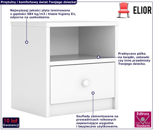 Облаштування дитячої кімнати - справжнє випробування для кожного батька. Добре організований інтер'єр - це функціональний інтер'єр. Піклуючись про своїх найменших клієнтів, бренд Elior поповнив колекцію меблів Happy ще одним продуктом. Цього разу це тумбочка Happy 4X. Якісне виконання, увага до кожної, навіть найменшої деталі, найякісніші матеріали - це складові меблів, які прослужать Вашій дитині довгі роки. Бренд Elior із пристрастю створює меблі, приділяючи особливу увагу їх естетичності та функціональності. Happy 4X - це виріб із твердих матеріалів. Корпус виготовлений з високоякісного ламінованого меблевого щита товщиною 18 мм, класу гігієни Е1 і підвищеної щільності 684,8 кг/м3 за стандартом EN 323. Все це надає меблям надзвичайно естетичний вигляд, а також також стійкий до подряпин і всіляких механічних пошкоджень. На відміну від конкуруючих продуктів, технологія Elior не містить хлору, важких металів і нафтових сполук, завдяки чому не знебарвлюється, а меблі легко підтримувати в чистоті. Запевняємо Вас, що у процесі виробництва меблів ми використовували екологічні та сертифіковані матеріали, які відповідають європейським стандартам безпеки. Шухляди на роликових напрямних - це інвестиція в зручне і, перш за все, безпечне використання. Місткий ящик і відкрита полиця - це практичний і зручний спосіб зберігання іграшок, книг або інших дитячих речей. Також важлива верхня частина шафи, куди ваша дитина розмістить нічник, будильник або улюблену фотографію. Універсальна, біла колірна гамма - це інвестиція в предмет меблів, який ідеально впишеться в естетику кімнати як маленької дитини, так і підлітка. Додатковою перевагою меблів є можливість вибору кольору фасаду. Виберіть білий, рожевий, синій і зелений. Шафа Happy 4X - чудова ідея для кімнати як хлопчика, так і дівчинки. Тут кожен знайде щось для себе. Разом з брендом Elior створіть комфортну та безпечну кімнату для вашого малюка.