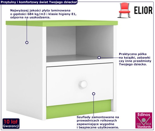 Облаштування дитячої кімнати - справжнє випробування для кожного батька. Добре організований інтер'єр - це функціональний інтер'єр. Піклуючись про своїх найменших клієнтів, бренд Elior поповнив колекцію меблів Happy ще одним продуктом. Цього разу це тумбочка Happy 4X. Якісне виконання, увага до кожної, навіть найменшої деталі, найякісніші матеріали - це складові меблів, які прослужать Вашій дитині довгі роки. Бренд Elior із пристрастю створює меблі, приділяючи особливу увагу їх естетичності та функціональності. Happy 4X - це виріб із твердих матеріалів. Корпус виготовлений з високоякісного ламінованого меблевого щита товщиною 18 мм, класу гігієни Е1 і підвищеної щільності 684,8 кг/м3 за стандартом EN 323. Все це надає меблям надзвичайно естетичний вигляд, а також також стійкий до подряпин і всіляких механічних пошкоджень. На відміну від конкуруючих продуктів, технологія Elior не містить хлору, важких металів і нафтових сполук, завдяки чому не знебарвлюється, а меблі легко підтримувати в чистоті. Запевняємо Вас, що у процесі виробництва меблів ми використовували екологічні та сертифіковані матеріали, які відповідають європейським стандартам безпеки. Шухляди на роликових напрямних - це інвестиція в зручне і, перш за все, безпечне використання. Місткий ящик і відкрита полиця - це практичний і зручний спосіб зберігання іграшок, книг або інших дитячих речей. Також важлива верхня частина шафи, куди ваша дитина розмістить нічник, будильник або улюблену фотографію. Універсальна, біла колірна гамма - це інвестиція в предмет меблів, який ідеально впишеться в естетику кімнати як маленької дитини, так і підлітка. Додатковою перевагою меблів є можливість вибору кольору фасаду. Виберіть білий, рожевий, синій і зелений. Шафа Happy 4X - чудова ідея для кімнати як хлопчика, так і дівчинки. Тут кожен знайде щось для себе. Разом з брендом Elior створіть комфортну та безпечну кімнату для вашого малюка.