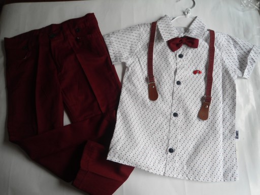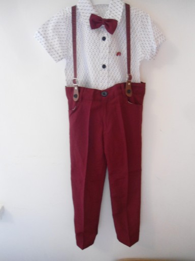 Комплект складається з 4 частин: темно-бордових штанів на підтяжках такого ж кольору та елегантної білої сорочки з ніжним малюнком по всій поверхні. У комплект також входить краватка-метелик темно-бордового кольору. Комплект підійде для різних видів урочистостей, дозволяючи хлопчику виглядати дуже модно і елегантно.Штани мають регульований пояс.Тканина брюк тонка і ніжна.