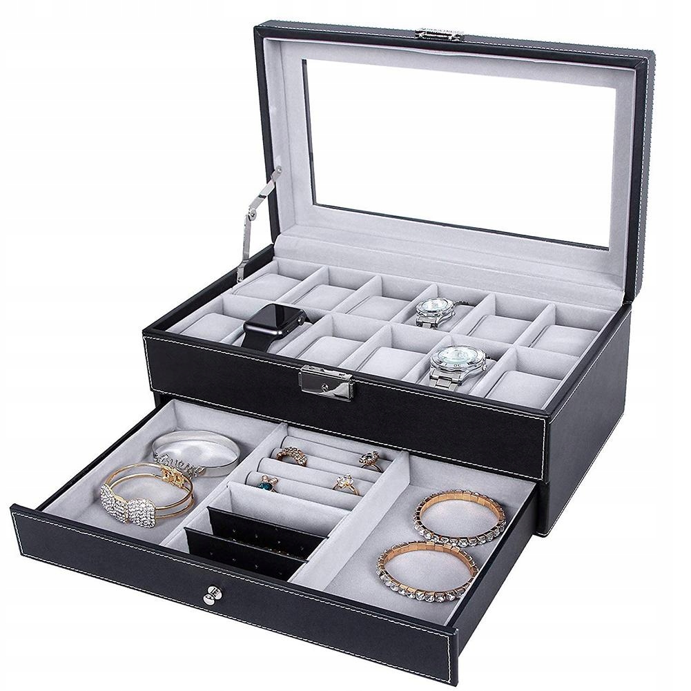 - Górna warstwa zmieści 12 zegarków, szufladka posiada przegródki na pierścionki, kolczyki, naszyjniki, bransoletki itp.