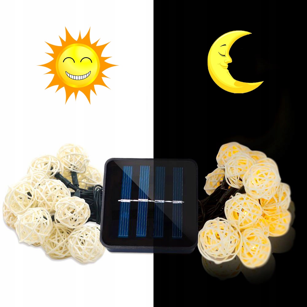 Całkowita długość: 6.5 metrów (długość kabla od panelu słonecznego do pierwszej lampy wynosi 2 metry. Odległość między każdą lampą wynosi 15 cm Całkowicie 30 lamp)