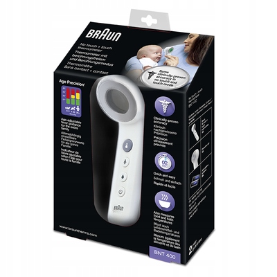 BNT400 łączy w sobie łatwość użycia zarówno bezdotykowego, jak i dotykowego pomiaru z unikalną technologią Age Precision® firmy Braun, która pomaga rodzicom wyeliminować wątpliwości pomiaru temperatury.