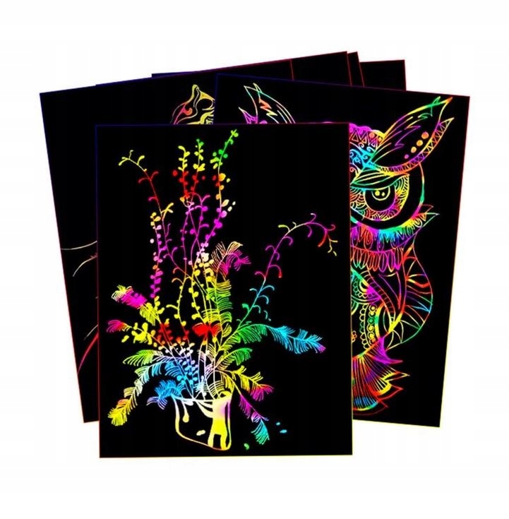 Zestaw kartek do zdrapywania to nowoczesna forma zabawy uruchamiająca u dziecka wyobraźnię już od najmłodszych lat. Sprawi ona, że Twoje dziecko rozwinie kreatywność oraz zdolności manualne. Będzie to świetna alternatywa dla zwykłego rysowania kredkami. Zabawa polega na wydrapywaniu wierzchniej, czarnej powłoki w taki sposób aby powstał obrazek. Maluch ma nieograniczone możliwości w tworzeniu kształtów oraz rysunków, które z pewnością będą o wiele ciekawsze od tych standardowych.