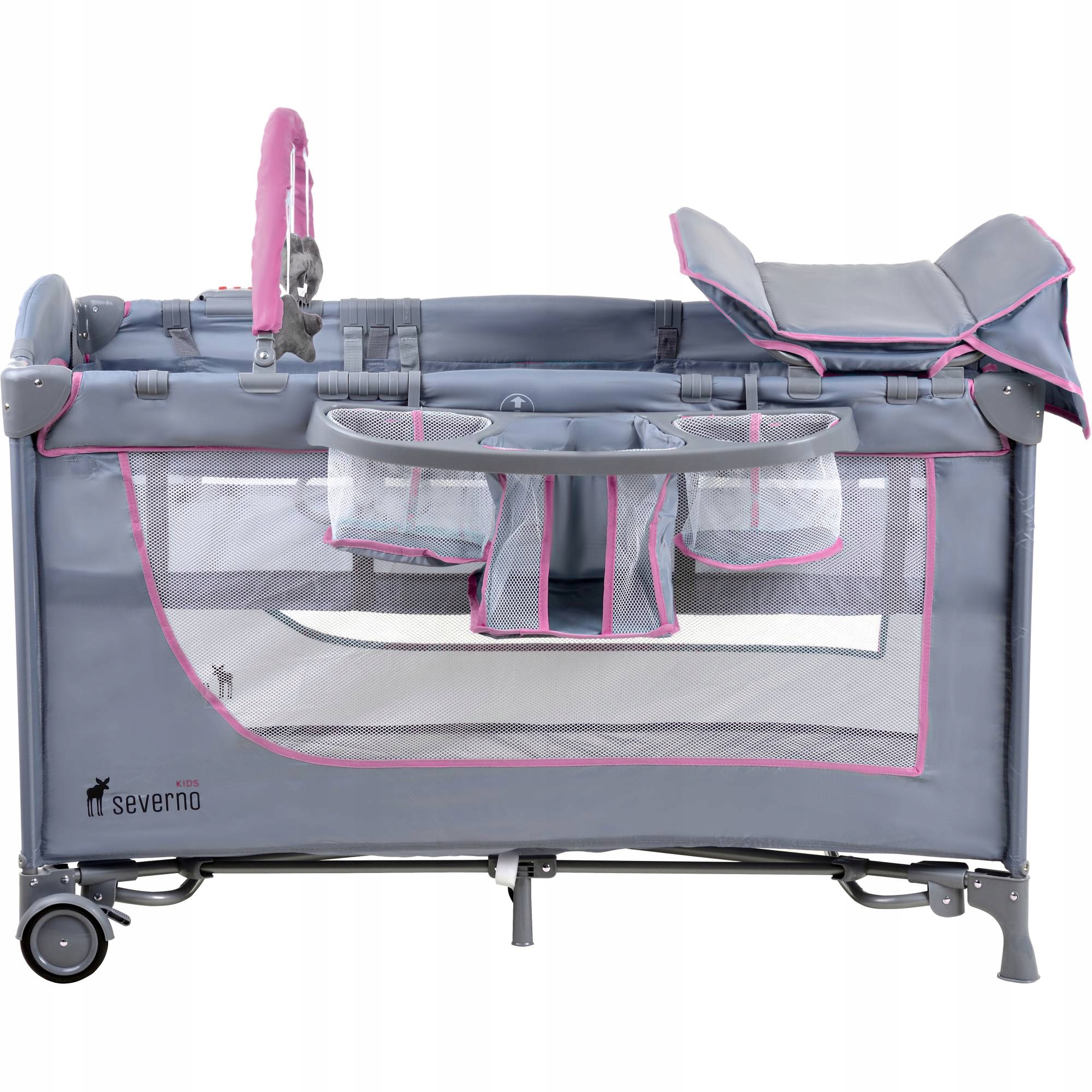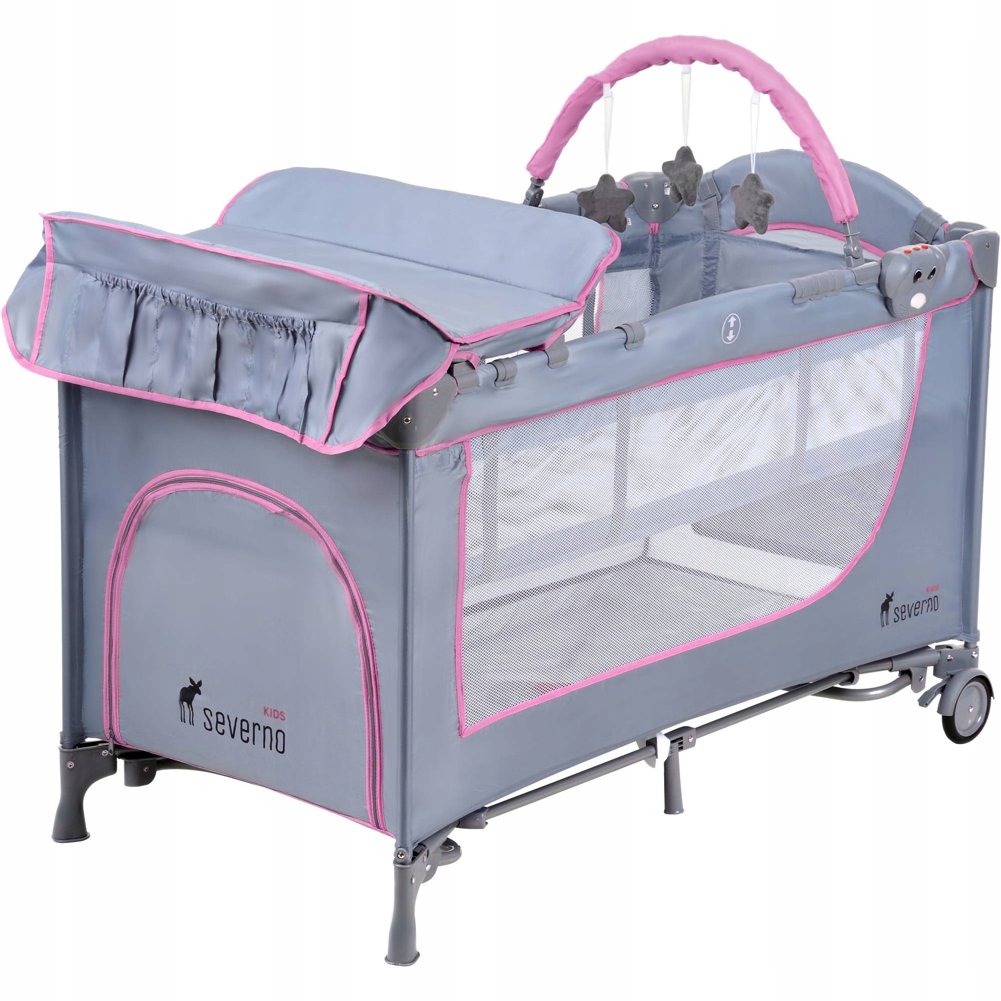 - Bogata gama akcesoriów: podwieszany drugi poziom/materac dla niemowlaków, panel/przybornik z trzema pojemnikami na pieluszki i kosmetyki do pielęgnacji, pałąk z zabawkami, przewijak, moskitiera interaktywny piesek z pozytywką i wibracjami płozy do bujania torba do przenoszenia łóżeczka okrągłe uchwyty pomagające dziecku wstawać/siadać, podpierać się, podciągać i rozwijać koordynację ruchową
