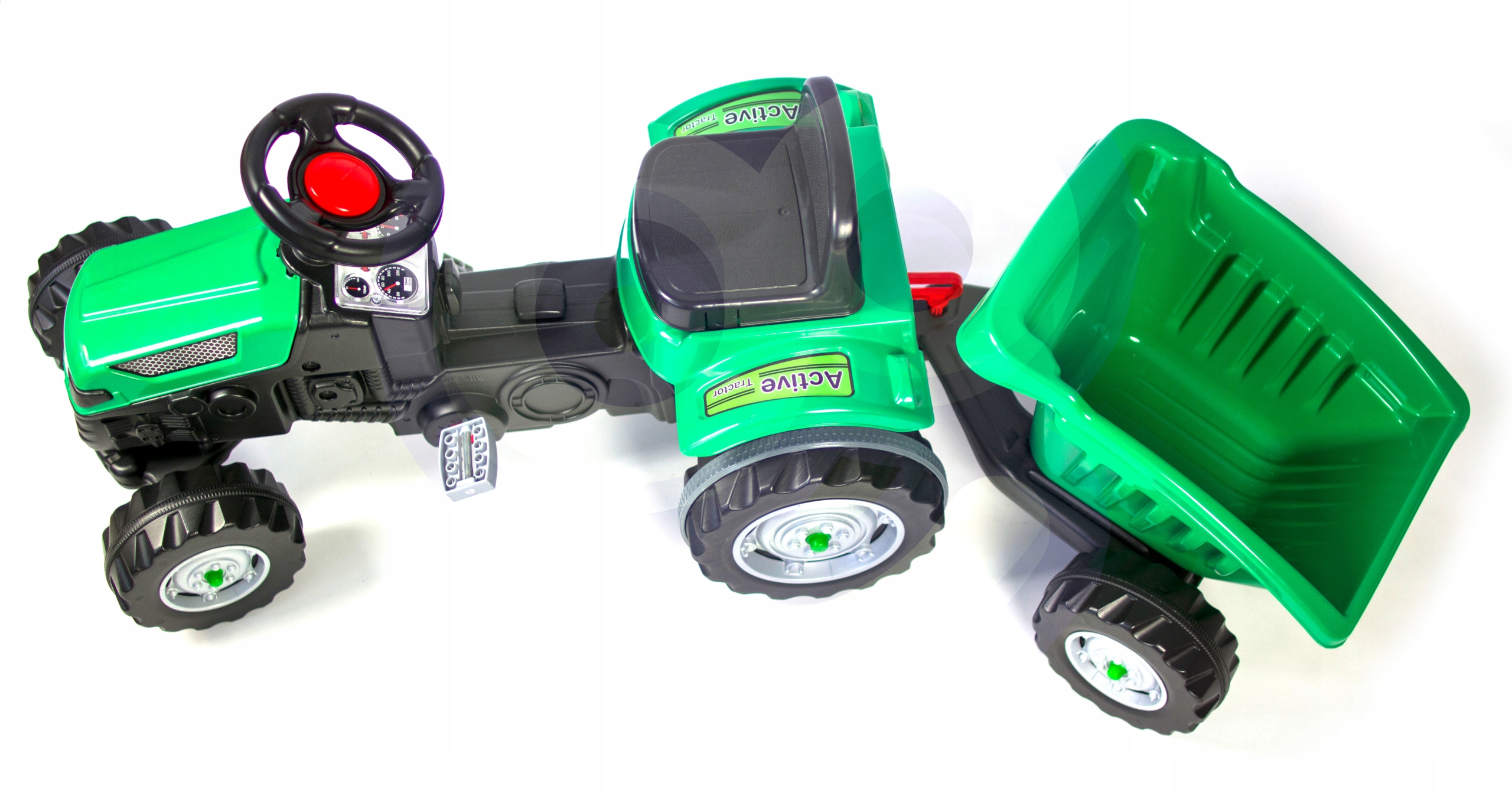 Traktor na pedały MAX z przyczepą w kolorze zielonym to idealna zabawka do rozpoczęcia przygody z pojazdami na pedały.
