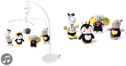 Універсальний мобіль - ідеальний продукт для маленької дитини, який полегшує засинання. Контрастні фігури привернуть його увагу, а звук музичної скриньки заспокоїть. Завдяки спеціально розробленій ручці, карусель можна встановити як в туристичне крісло, так і в дерев'яне.