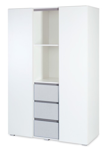 3-х сегментна шафа Dalia дуже функціональна, має з одного боку великий простір між полицями, що дозволяє чітко розташувати одяг вашої дитини. З іншого боку шафи розташовані дві підвісні штанги, а в середині шафи додаткові пачки і три містких ящика для дрібничок вашого малюка.
