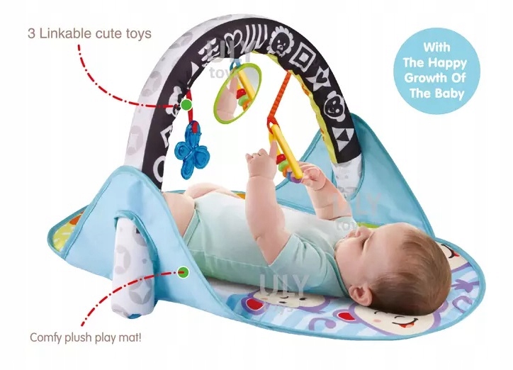 Nasza mata edukacyjna KINDER_PLAY świetnie się sprawdza przez cały pierwszy rok, a nawet dłużej. Niemowlę bacznie obserwuje kolorowe kształty zabawek podwieszonych na pałąkach. Stopniowo zaczyna wyciągać do nich rączki, próbując je złapać. Dostosowana do 3 najważniejszych etapów rozwoju malucha: leżenie na plecach, leżenie na brzuszku, siadanie i raczkowania. Grudsza niż u konkurencji grubość maty zapewni Maluszkowi komfort i bezpieczeństwo podczas codziennej zabawy.
