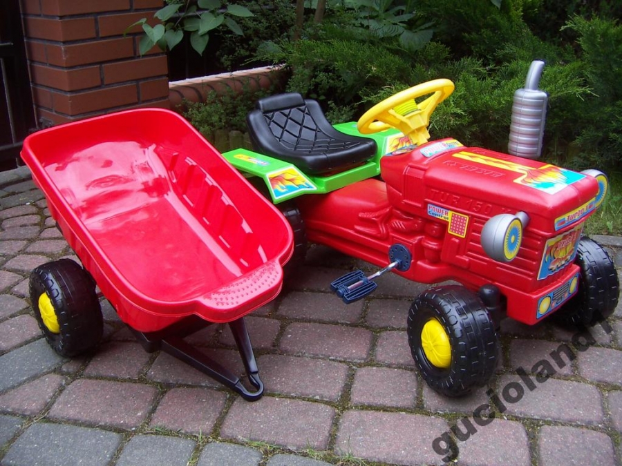 TRAKTOREK POSIADA NAPĘD NA PEDAŁKI ( Z MECHANIZMEM ŁAŃCUCHOWYM ) ORAZ SKRĘTNĄ KIEROWNICĘ, ZA POMOCĄ KTÓREJ DZIECKO KIERUJE CAŁYM ZESTAWEM !!!!
