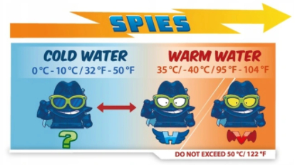 Umieść je z powrotem w zimnej wodzie (0ºC - 10ºC), aby ponownie zakamuflować oczy! W tej serii Secret Spies ultra rzadki zmienia kolor, gdy umieścisz go w gorącej wodzie!