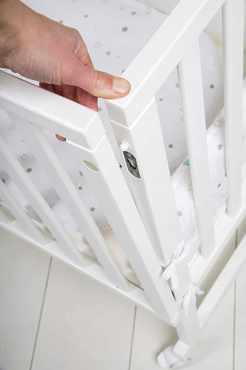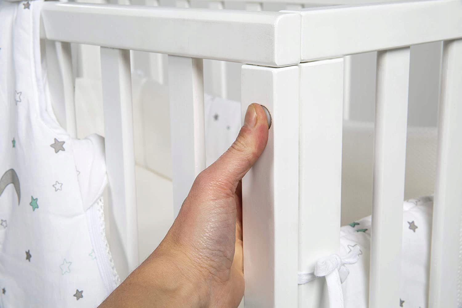 - Łóżko jest wyposażone w boczną kratkę, którą można przymocować lub usunąć za pomocą systemu zatrzaskowego.