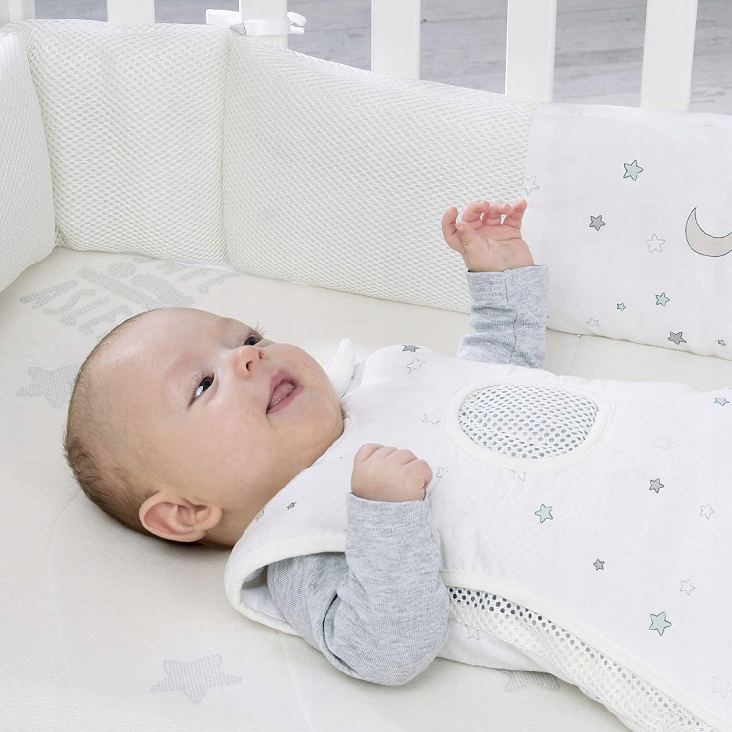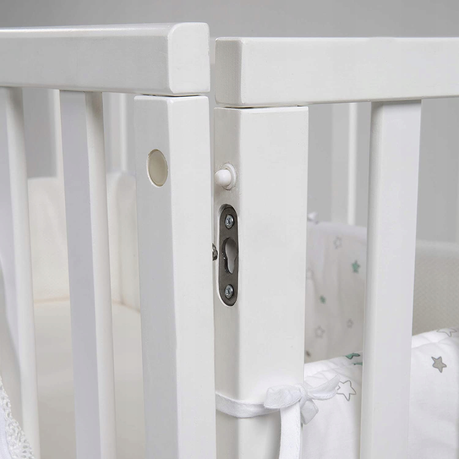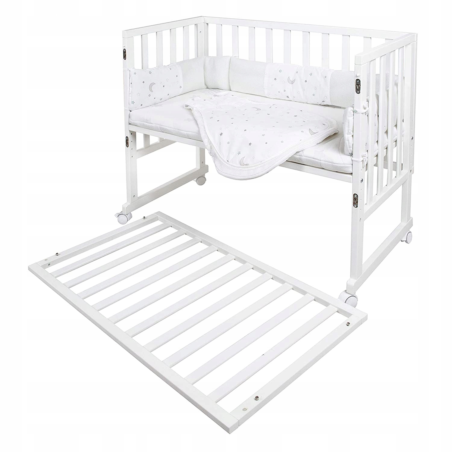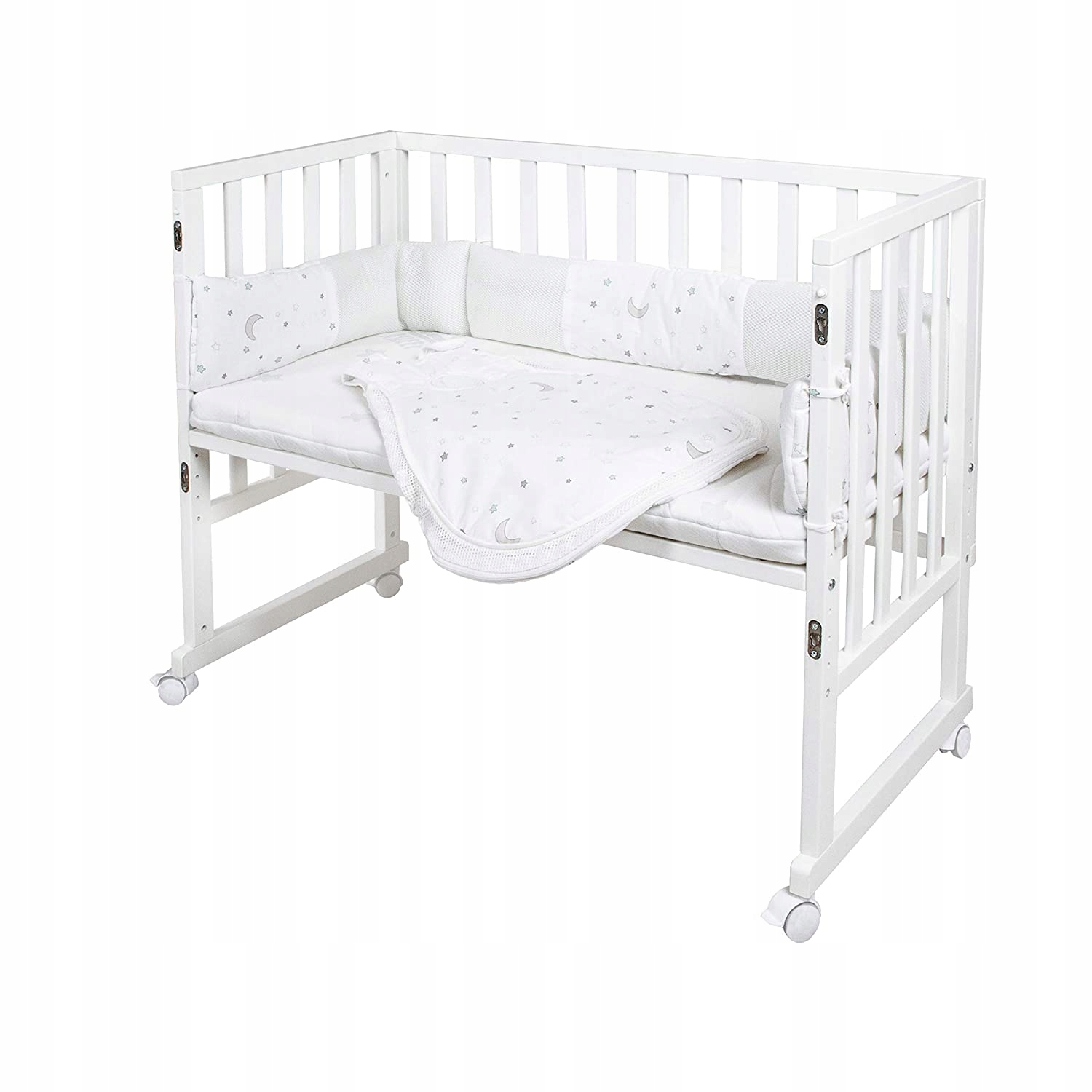 - Łóżko wiklinowe „Safe asleep 3 w 1”, lakierowane na biało, z motywem czarodziejskich gwiazd, może być używane jako łóżko pomocnicze do łóżka dla rodziców, łóżka i ławki.