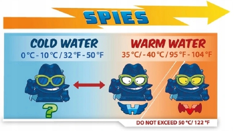 Umieść figurkę w ciepłej wodzie (35ºC - 40ºC), a kolor ich oczu zostanie ujawniony: biały kolor jest zarezerwowany dla bohaterów a żółty dla złoczyńców.