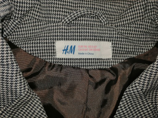 Елегантна і зі смаком куртка H&M для маленької дівчинки, візерунок гусяча лапка, чорно-світло-коричневий, застібається на 3 кольорові гудзики (один відсутній), зліва пришитий бантик, рукава-буфи, штучні кишені, гудзики на манжетах, оригінальний розріз зліва. спинка, що вказує на епізодичне використання або загальне носіння - виглядає як нова, розмір 116, розміри: