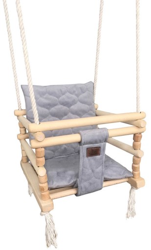 - Подушки оброблені якісним, приємним на дотик оксамитовим матеріалом River 3XT фірми Elior. Тканина легка, стійка до пошкоджень і неймовірно ніжна. Для максимального комфорту під час гойдання ми наповнили подушки ватою найвищої якості. Модні сірі кольори додатково підкреслюють вишуканий дизайн іграшки.